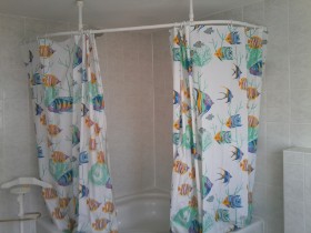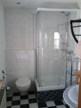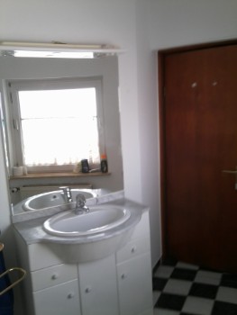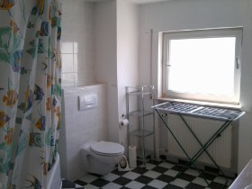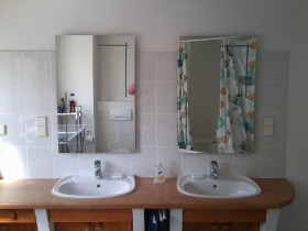 Bad 2 : Dusche/Wanne, zwei Waschbecken und Toilette, Wäscheständer